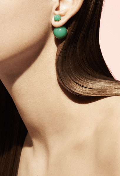You can wear this new Dior earring in both ears or just in one. This season Dior bijoux designer Camille Miceli presents the news which is as simple as ingenious. The smaller one bead rests on the ear while the larger one can be seen behind, as though accompanying the first in contrast.