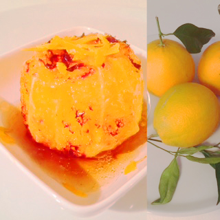 Очистить апельсин от корки, разогреть сковородку. положить в нее фруктозу и налить воду. Как только жидкость закипит, обмакнуть апельсин с каждой стороны,